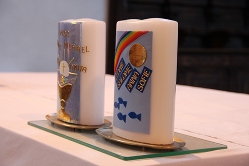Erstkommunion "Jesus, der Herr, nahm in der Nacht, in der er ausgeliefert wurde, Brot, sprach das Dankgebet, brach das Brot und sagte: Das ist mein Leib für euch. Tut dies zu meinem Gedächtnis!" (1Kor 11,23b-24) „Kommunion” bedeutet Gemeinschaft und wird dort Wirklichkeit, wo Menschen sich zum Gottesdienst versammeln, um miteinander das Sakrament der Eucharistie zu feiern. Taufe, Eucharistie und Firmung bilden eine schrittweise Hinführung zum mündigen Christsein. Im Kreis der Familie, der Klassengemeinschaft und der Pfarrgemeinde erfährt das Kind die Zusage Gottes: „Ich habe dich in meine Gemeinschaft gerufen und lasse dich nicht allein.” |
